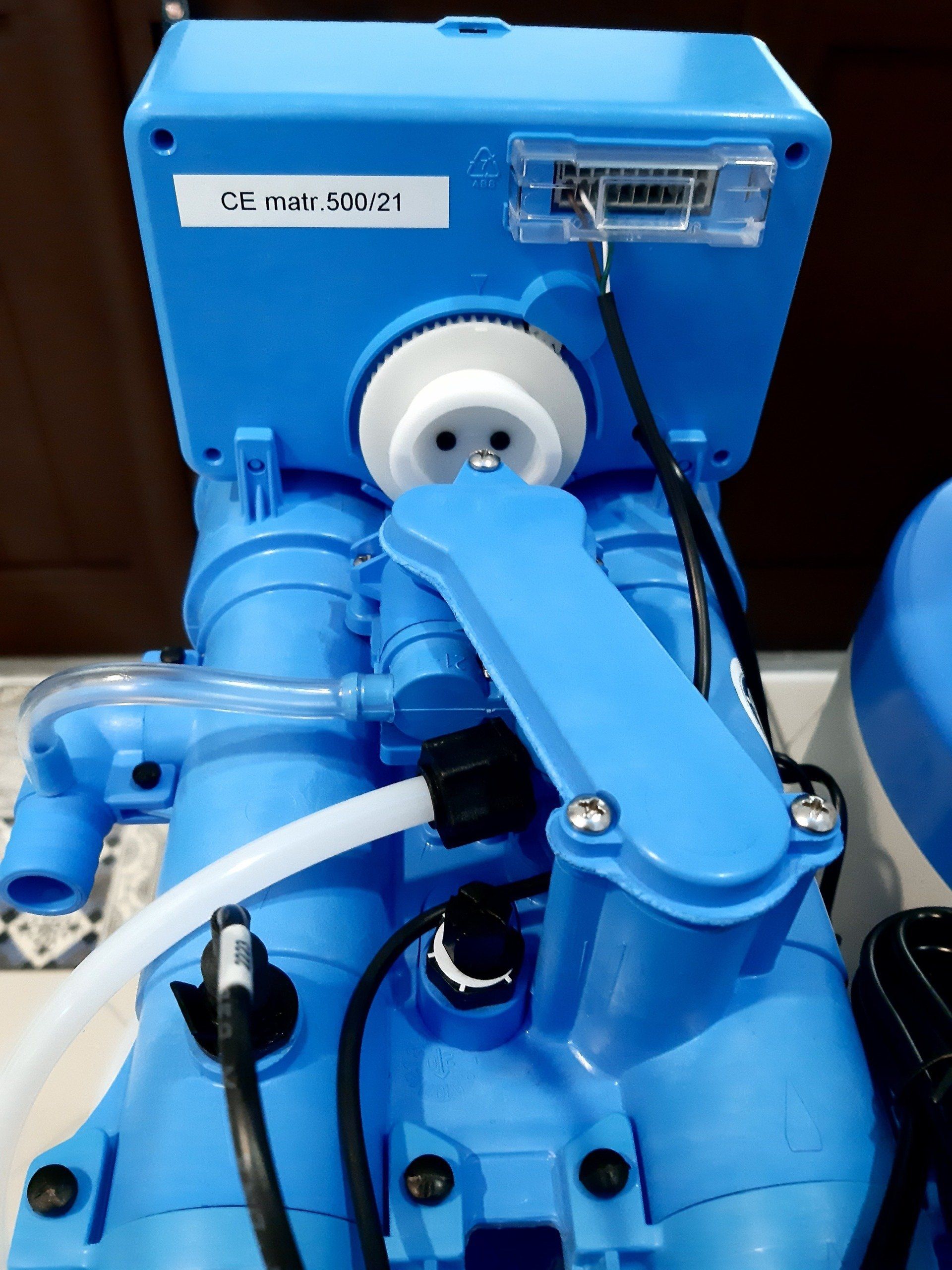 - Dotato di timer elettrico a volume, un sistema moderno ed affidabile. Il timer avvia la rigenerazione a comando volumetrico, cioè in base alla quantità d'acqua realmente utilizzata: dal momento che il consumo d'acqua per ogni abitazione e famiglia di solito è variabile, il sistema adeguala frequenza dei cicli di rigenerazione delle resine a seconda delle effettive esigenze. Questo consente una maggiore efficienza e un notevole risparmio di sale ed acqua.